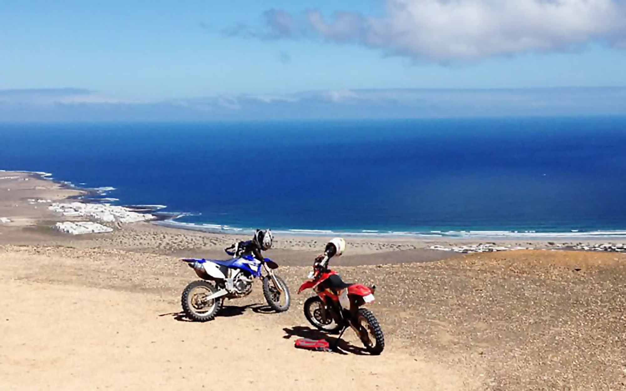 Most tours will include a variety of terrains. There are coastal sandy parts on the North West coast riding beside the full power of the ocean. Up by Teguise there is a great cliff top section with views down to Famara and across to the island of Graciosa. Further North you ride along dried river beds and into the middle of the island. It is easy to look around and be surprised at where you are and what the island has to offer. Every rider to do Enduro on Lanzarote is surprised by how good and varied the riding is.