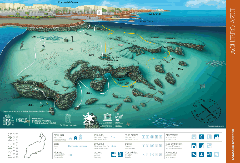 Firstly is the ‘Blue Hole’ at a depth of twenty to thirty meters. Billed as Lanzarote’s most known dive site. Its a large cave you enter through the hole, dive through the cave then exit. The clear blue sea is a shelter to many fish including Groupers, Sharks, Rays and other large underwater species. Dive depth at this site is twenty four to thirty meters.