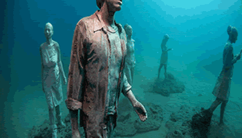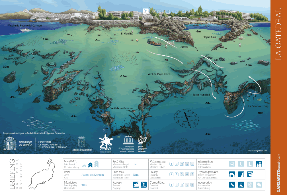 SUBA dives start at Playa Dorada because of the ample space, easy parking and entrance to the sea. Easy acclimatization in the bay area then swimming outside the break water. Here the water is very clear and there is a great variety of fish including Barracudas, Sea Bream, Sardines, Tuna, Angel Sharks, Rays and many many more . An original feature is the Worlds only underwater museum. On the sea bed some fourteen meters below the surface lay sculptures. Created from live Lanzarote residents moulds were taken and turned into ocean floor art. Since installation sea life has populated the area quickly creating a special and unique dive experience.